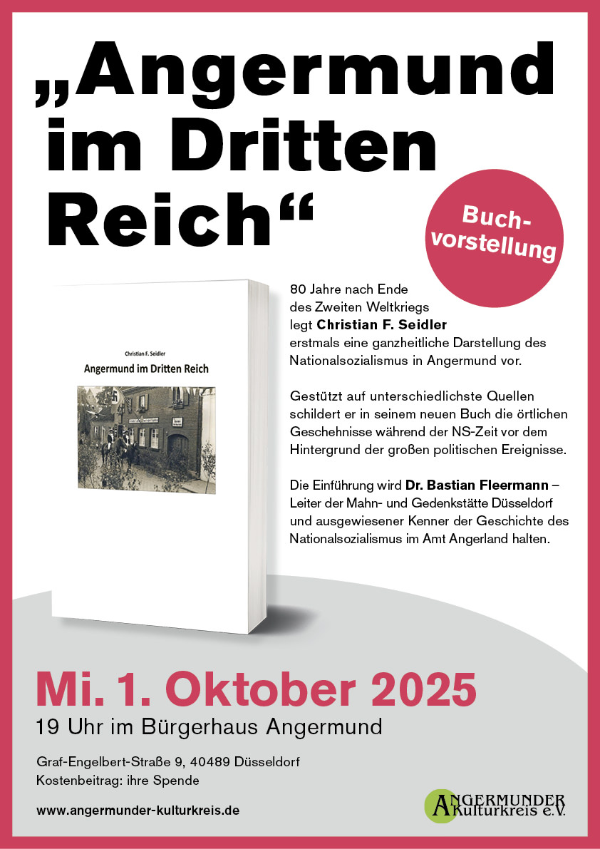 stehenden Servern der Telekom AG gespeichert und unterliegt dem europäischen Urheberrecht. 18.02.2025 Über Veranstaltungen zur 50. Wiederkehr der Kommunalen Gebietsreform, bei der das Amt Angerland aufgelöst und Angermund nach Düsseldorf eingemeindet wurde, informiert ab sofort die Seite Eingemeindung 1975. 08.02.2025 Der Düsseldorfer Geschichtsverein e.V. lädt zur Vorstellung des Düsseldorfer Jahrbuchs 2024 ein. Diese findet am Mittwoch, den 26. Februar 2025 um 15.00 Uhr im Beatrice-Strauss-Zentrum am Marktplatz 2 in Düsseldorf statt. Im Beisein von einigen Autoren und Mitgliedern des Redaktionsteams stellt der Verein die zehn interessanten und aufschlussreichen Beiträge des 94. Bandes vor (darunter auch "Die französische Besetzung der Bürgermeisterei Angermund im Jahr 1923"). 21.01.2025 Leider kamen nur 20 Damen und Herren zu meinem gestrigen Vortrag beim Düsseldorfer Geschichtsverein e.V. Doch diese Besucher zeigten großes Interesse am Thema "Die französische Besetzung der Bürgermeisterei Angermund im Jahr 1923". Kern des Vortrags war ein einzigartiges Zeitzeugnis, die literarisch anspruchsvolle Beschreibung der Geschehnisse durch die damals in Angermund wohnende Beate Hahn. Im zweiten Teil des Vortrags stellte ich die Biografie der bedeutenden Gartenpädagogin dar, die Ende 1927 nach Berlin zurückkehrte und Ende 1938 vor der nationalsozialistischen Verfolgung aus Deutschland fliehen musste. Ich hoffe, dass ich den Besuchern, darunter auch einigen treuen Angermundern, einen wenig präsenten Aspekt unserer Ortsgeschichte und die heute leider kaum noch bekannte Beate Hahn nahebringen konnte. Vorberichte der Veranstaltung erschienen in der Rheinischen Post und im Nordboten. 01.01.2025 Heute vor 50 Jahren wurde Angermund nach Düsseldorf eingemeindet. 13.12.2024 Die überarbeitete Einleitung zur Familienforschung Seidler verdeutlicht jetzt besser als bisher die ostpreussische Herkunft meines Urgroßvaters Friedrich Ferdinand Seidler und seiner Vorfahren. 08.12.2024 Seit heute, 2. Advent, ist das Fotoalbum von der Buchpräsentation online. Allen Besuchern dieser Homepage weiterhin eine schöne Adventszeit! 30.11.2024 Am Dienstag